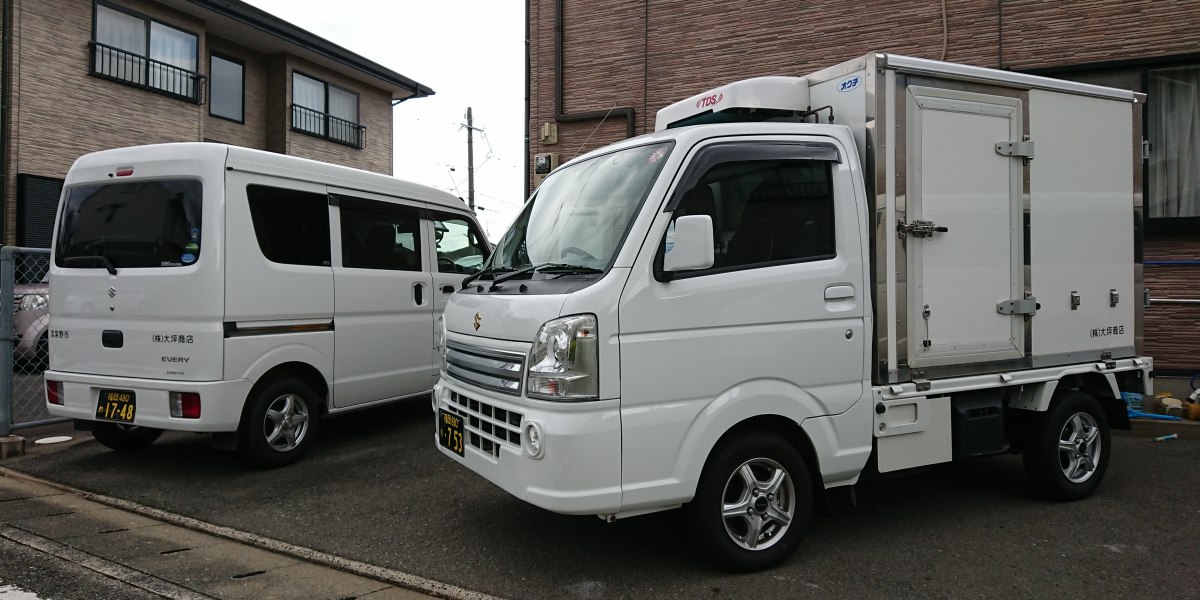 軽チルド車(冷蔵・冷凍)24台、軽ワゴン車3台、幌車1台の計28台。(2020年8月時)